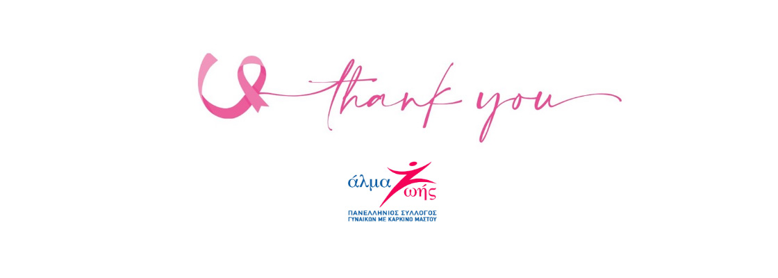 Το Διοικητικό Συμβούλιο του Πανελληνίου Συλλόγου Γυναικών με Καρκίνο Μαστού «Άλμα Ζωής» σας εκφράζει τις θερμές του ευχαριστίες για την ευγενική σας δωρεά του ποσού των 400,00€ (Τετρακόσια Ευρώ) υπέρ των σκοπών και του έργου του συλλόγου μας εις μνήμη Χρήστου Βελισσαρόπουλου.